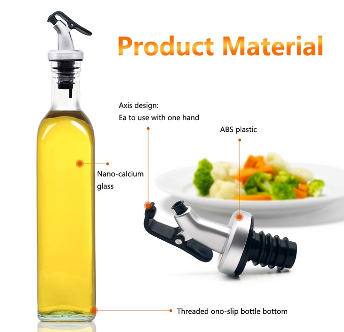 - Stainless Steel Pourer Olive oil bottle set glass dispenser vinegar cruet for cooking or salad dressing. Set of 2 different designs.