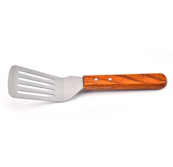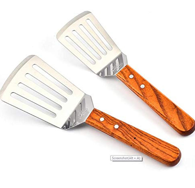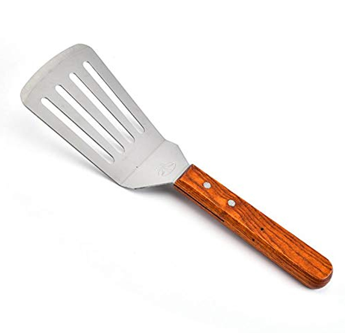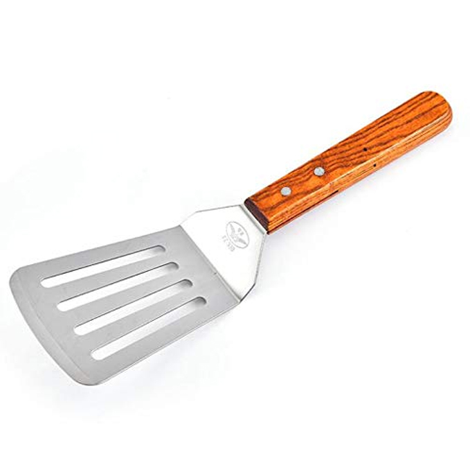 - FIRM GRIP - ergonomic and comfortable wooden handle with hole for easy hanging. Flat spatula stainless steel turner are very well balanced . Metal spatula is hand wash only.
