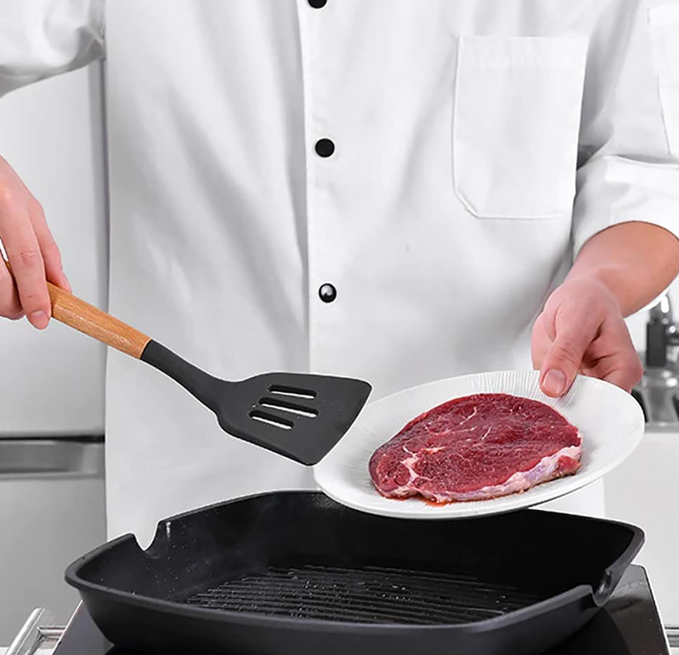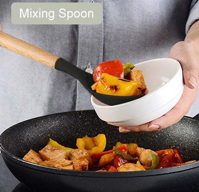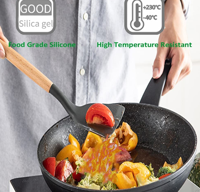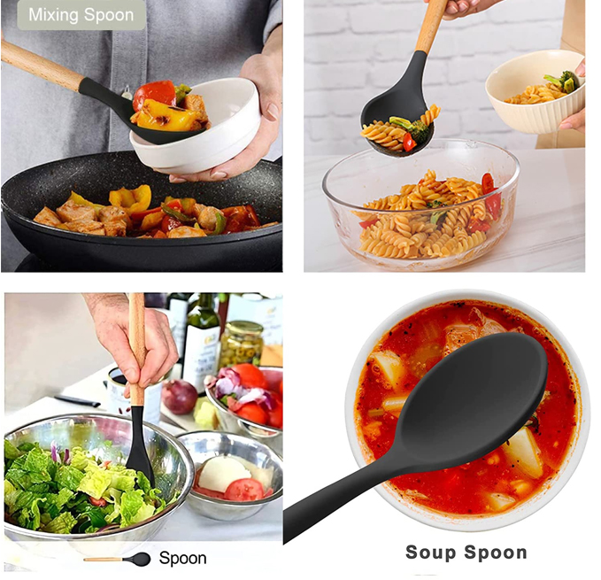 - Silicone Utensil Set is Kitchen helper, perfect for all types of foods and cooking & kitchen accessaries, stir fry, stirring cream, butter, ice cream etc. Wooden handle design is comfortable to hold, clean when not in use, and can be hung without taking up space