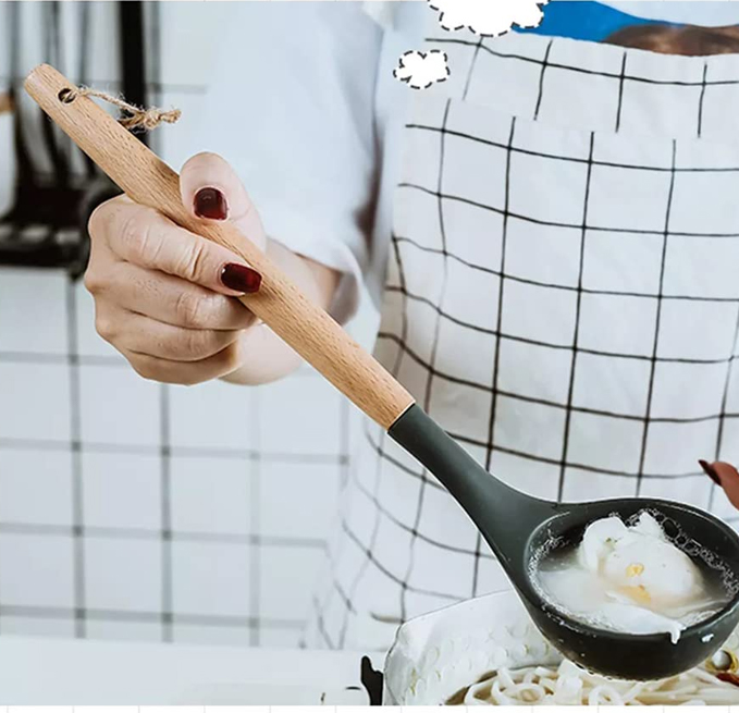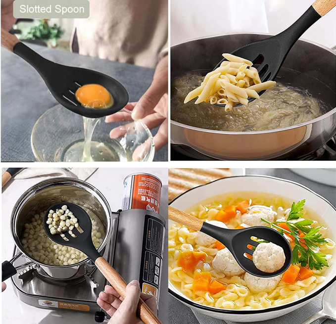 - This Kitchen utensil set with durable woodle handle is Important for the kitchen! Easy-to-grip, and balanced weight make cooking a joy and their large hanging holes help keep your cookware set orderly and organized. Cooking with the non stick silicone utensils set will protect your cookware from any scratches, provide a pleasurable cooking experience.