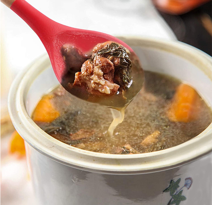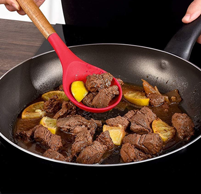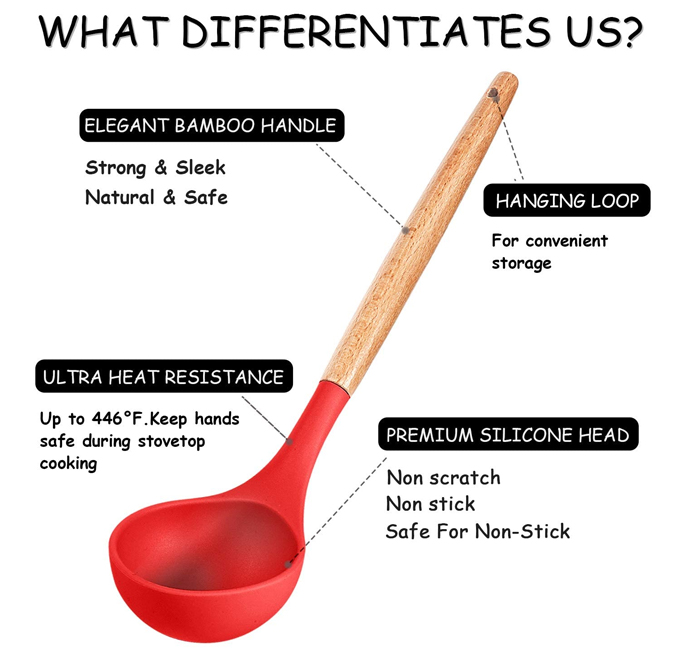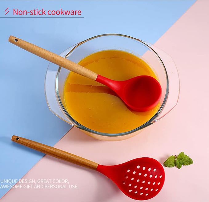 - This Kitchen utensil set with durable woodle handle is Important for the kitchen! Easy-to-grip, and balanced weight make cooking a joy and their large hanging holes help keep your cookware set orderly and organized. Cooking with the non stick silicone utensils set will protect your cookware from any scratches, provide a pleasurable cooking experience.