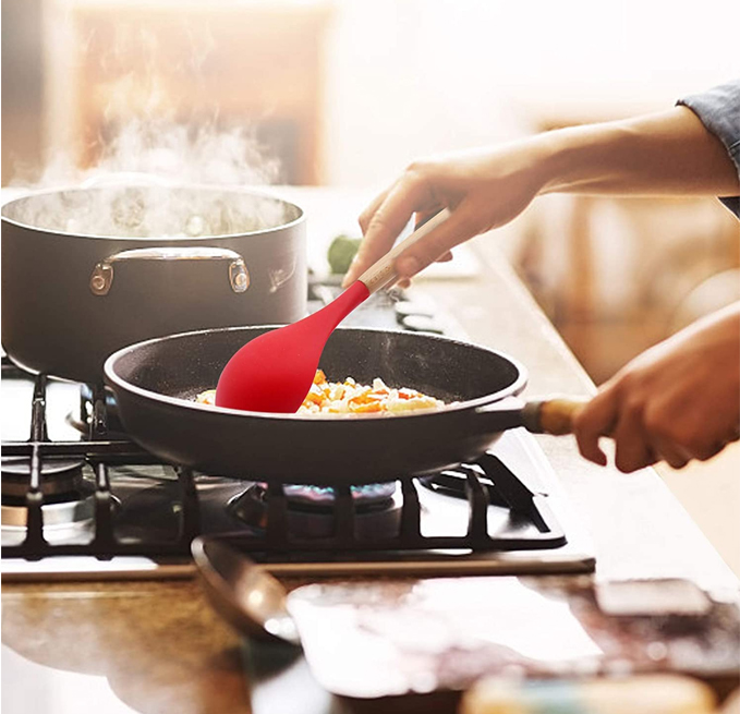 - Silicone Utensil Set is Kitchen helper, perfect for all types of foods and cooking & kitchen accessaries, stir fry, stirring cream, butter, ice cream etc. Wooden handle design is comfortable to hold, clean when not in use, and can be hung without taking up space
